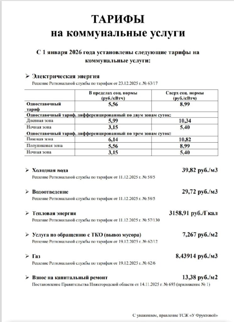 В связи с повышением ставки НДС на 2%, с 01.01.2026г. увеличилась стоимость тарифов (кроме вывоза мусора и взноса на капремонт).